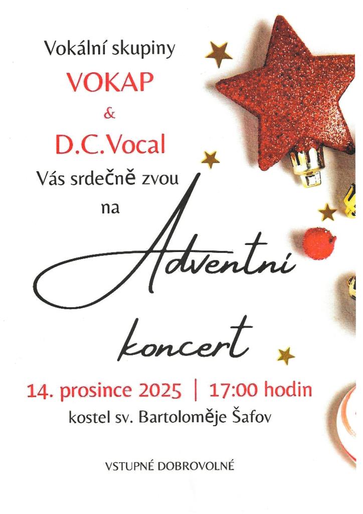 Srdečně vás zveme na koncert vokálních skupin VOKAP a D.C.Vocal, který se uskuteční 14. prosince 2025 v kostele sv. Bartoloměje v Šafově. Přijďte si poslechnout krásné melodie a užít si jedinečnou atmosféru. Vstupné je dobrovolné. Těšíme se na vaši účast.